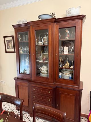 Mueble de salón de madera de caoba, con vitrinas y cajones. - Diseño clásico y elegante. - Acabado en madera de caoba. - Vitrinas con puertas de cristal. - Cajones con tiradores decorativos.