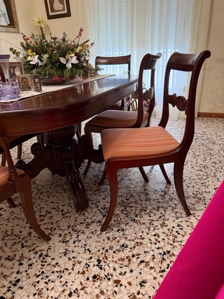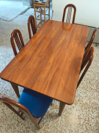 Conjunto de mesa extensible de madera con cuatro sillas. - Sillas con asientos de tela azul. - Estructura de las sillas y mesa en madera marrón. - Medidas 150 cm de largo, 85 cm de ancho y 76 cm de alto. - Extendida mide 240 cm de largo.