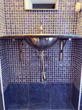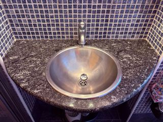 Conjunto de lavabo de acero inoxidable y encimera. - Lavabo de metal. - Encimera de piedra.