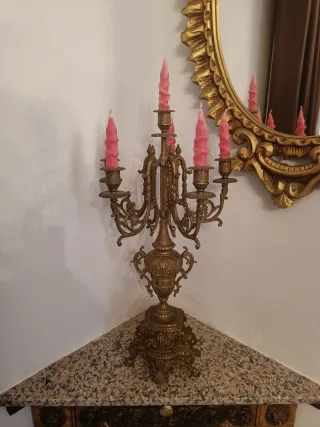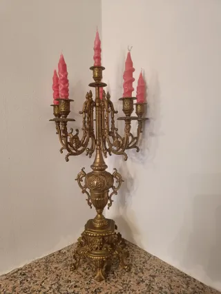 Elegante candelabro de bronce con un acabado dorado, adornado con detalles ornamentales. - Diseño clásico de cinco brazos. - Incluye cinco velas cónicas de color rosa. - Base robusta y decorativa.