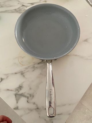 Tres sartenes de la marca Cookersway con un diseño moderno y funcional. - Interior de cerámica antiadherente. - Mango de metal ergonómico. - Color gris y plateado.