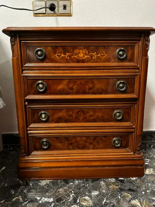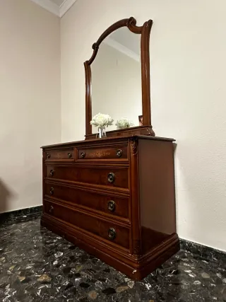 Conjunto de muebles para dormitorio de matrimonio. - Cómoda de madera oscura con espejo. - Cuatro cajones amplios en la cómoda. - Tiradores metálicos en los cajones. - Diseño clásico y elegante.