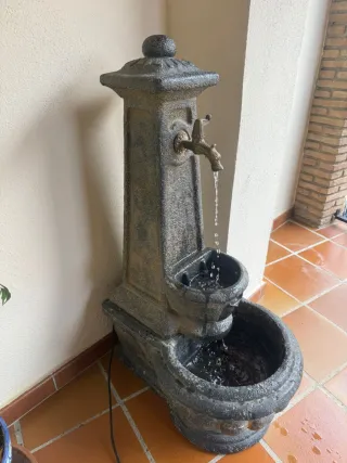 Fuente de piedra con un diseño clásico y elegante, perfecta para añadir un toque de encanto a tu jardín, patio o cualquier zona interior de tu casa. - Acabado rústico. - Diseño de cascada. - Fuente eléctrica con compromiso ambiental. Funciona con su propia agua reciclada en circuito cerrado. - Ideal para exteriores e interiores. - Fácil mantenimiento. - Es un objeto pesado y contundente que no reviste peligro para los niños, al contrario. - 110 cm de altura. Factible para cualquier rincón.