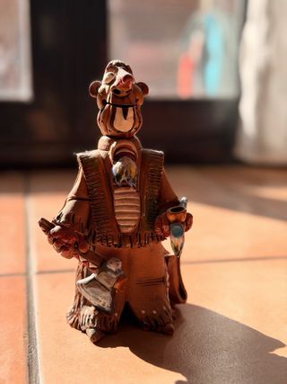 Conjunto de dos figuras decorativas de terracota con un diseño inspirado en la cultura nativa americana. Cada pieza está elaborada con gran detalle. - Figura de pie con hacha y pipa. - Figura sentada con cuenco. - Acabado artesanal.