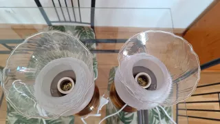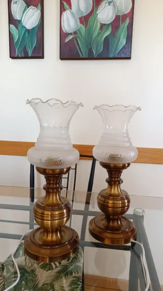 Elegante juego de dos lámparas de estilo vintage. Su diseño combina una base metálica dorada con pantallas de cristal transparente y esmerilado. Se vende juntas o separado. - Base de metal con acabado dorado. - Pantallas de cristal con detalles. - Diseño clásico y atemporal.