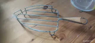 Este soporte para plancha combina un diseño clásico con materiales duraderos. - Estructura de metal plateado. - Mango de madera en tono marrón.