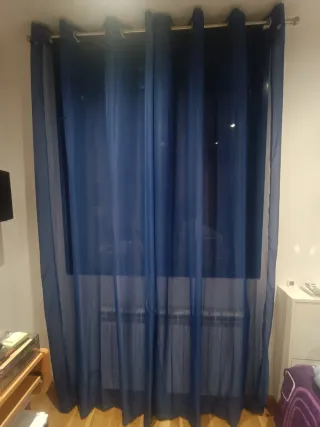 Juego de cortinas blancas translúcidas con ojales, ideales para añadir un toque de elegancia a cualquier habitación. - Medidas: 140 cm por 170 cm de alto. - Sistema de colgado con ojales metálicos. - Tejido ligero y vaporoso. - Poco uso, en perfecto estado. - También tengo un juego de 140 x 245 azules con más tiempo y algo descoloridas en el centro por la parte de atrás, la que pega a la pared. 8€ el juego azul.