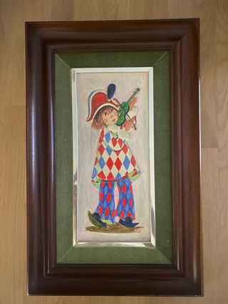 Bonito cuadro decorativo de un arlequín tocando el violín, pintura realizada en relieve y esmaltada. En perfecto estado. - Marco de madera. - Lienzo en relieve con diseño de arlequín, esmaltado. -paspartú de tela verde.
