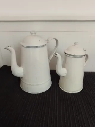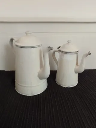 Vendo lote juego de 2 teteras de metal pintada lacado blanco antiguas. Ideal para restauración, decoración, escaparate, estilo elegante, vintage, antiguo, anticuario, coleccionista, restaurador, jarrón para flores, escaparate, estudio fotografía Medidas Base redonda 13 cms Altura 22cms Capacidad 2L Base redonda 10 cms Altura 20 cms Capacidad 1.5L Atiendo telefono, Whatsapp, SMS y correo electronico a cualquier hora Pago presencial, transferencia, Bizum o Paypal Tambien envios a nivel nacional y regalo gratis embalaje