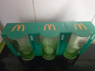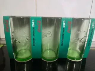 Conjunto de vasos de Coca-Cola, edición limitada de 2023. - Diseño con el logo de Coca-Cola. - Color verde translúcido. - Fabricados en vidrio.