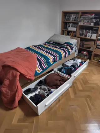 Cama individual de 90x200 cm, en excelente estado, casi a estrenar. Perfecta para habitaciones juveniles o de invitados. - Estructura de madera. - Funda de tela. - Cajones integrados para almacenamiento.