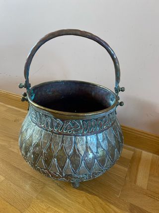 Macetero de estilo marroquí con un diseño intrincado. - Elaborado en metal con detalles en cobre y bronce. - Presenta un asa para facilitar su transporte. - Base con tres patas decorativas.