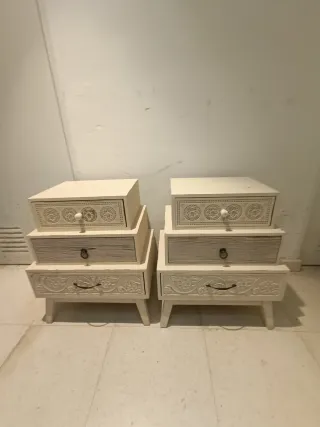 Conjunto de dos mesitas de noche de diseño boho envejecido con madera tallada en frontal de cajones. -Medidas Alto 61, Ancho 50, Fondo 35. - Diseño con tres cajones. - Acabado en color beige y blanco. - Elaboradas en madera.