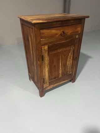 Mesilla de noche fabricada en madera maciza, con un diseño rústico y elegante. - Un cajón con tirador metálico. - Puerta con tirador metálico. - Acabado en tonos marrones Mesilla 45 de ancho x 33 de fondo x 64 de alto