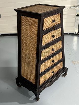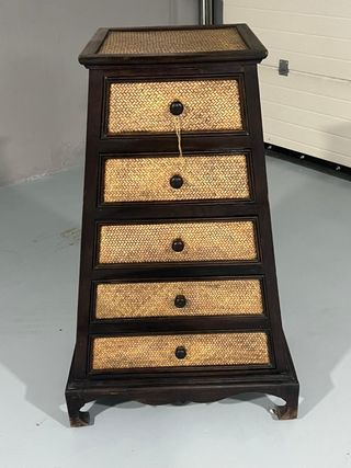 Mueble con diseño de trapecio y cinco cajones. - Acabado en madera oscura. - Frontales de cajón con tejido de rafia dorado. - Tiradores redondos negros.