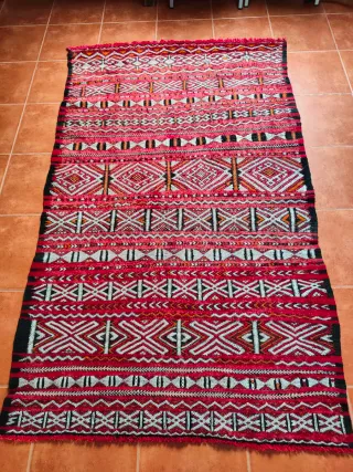 Alfombra de estilo bereber artesanal, con un diseño étnico, origen marroquí. Sus dimensiones son 148x240 cm. - Tejido con patrones geométricos tradicionales. - Tonos rojos, negro, blanco. - Acabado con flecos.