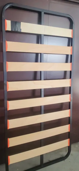 Base de cama con listones de madera y estructura metálica. - Medidas: 90x190 cm. - Listones de madera. - Marco exterior de metal. Ideal para una cama supletoria o para piezas y reparación. Las maderas han estado tapadas y cubiertas con plástico.Uno de los listones tiene cinta por rotura y un metal tiene una abolladura.