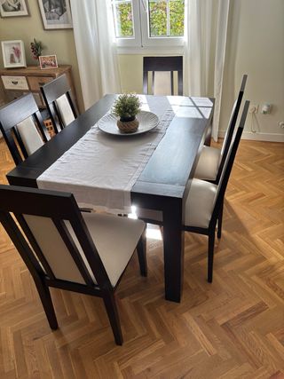 Conjunto de mesa extensible y seis sillas. - Mesa de madera oscura. Medidas 130X90 y extendida 180 - Sillas con asientos de tela beige. - Diseño moderno y elegante.