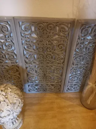 Preciosa talla decorativa con acabado gris envejecido. Ideal para dar un toque de estilo a tu hogar. - Diseño intrincado y detallado. - Acabado que aporta un aspecto vintage. - Puedes colocarla de cabecero o solo como decoración Tengo tres pero el precio es por unidad