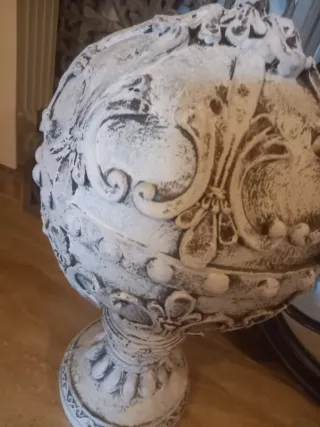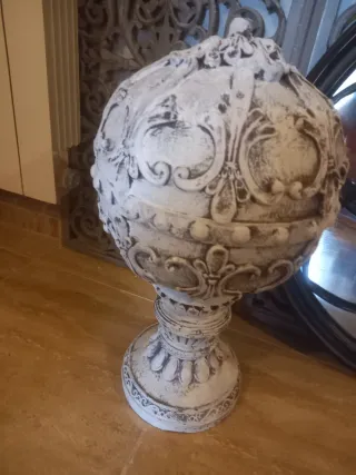 Elegante bola decorativa de gran tamaño, con un diseño intrincado y acabado envejecido. - Elaborada en piedra. - Tonos grises y blancos. Ideal para jardín o como atrezzo