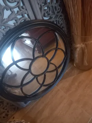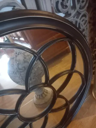 Elegante espejo con un diseño de celosía y un acabado envejecido que le da un toque vintage. Es de madera. - Marco con detalles ornamentales. - Diseño de celosía. - Acabado envejecido.