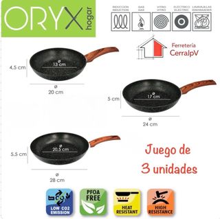 Juego de tres sartenes de aluminio antiadherente. - Diámetros: 20 cm, 24 cm y 28 cm. - Alturas: 4.5 cm, 5 cm y 5.5 cm. - Cuenta con 5 capas y un espesor de 4 mm. permitiendo que el calor se distribuya de forma rápida y homogéneamente. - Capa interior antiadherente, libre de PFOA. - Acabado marmolado en piedra tanto para el interior y el exterior, de gran resistencia a los arañazos y la abrasión. - Sartenes validas para todos los tipos de cocina (gas, eléctrico, vitro e inducción) - Mango engomado imitación a madera. Resistente al calor. Se mantiene frío al tacto para evitar quemaduras. - Se puede lavar en el lavavajillas