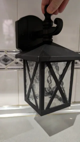 Elegante aplique de aluminio negro con cristal traslúcido 28cm desde el punto más alto, los cristales miden 10x15cm, el farol tiene 14cm de ancho. Para bombilla E27 Sin usar, en su embalaje original
