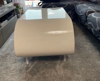Mesa de centro con un diseño moderno y curvo. Su acabado brillante le da un toque elegante a cualquier sala. - Forma ovalada. - Amplio espacio de almacenamiento inferior.