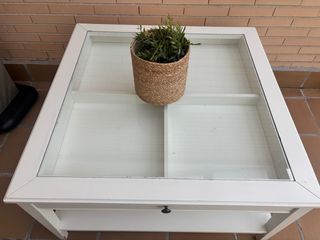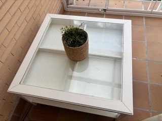 Mesa de centro modelo Liatorp de Ikea con superficie de cristal y compartimentos interiores. Se adjuntan fotos con el desgaste. - Medidas: 93x93 cm. - Acabado en blanco.