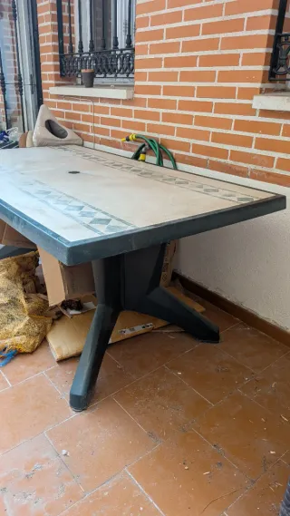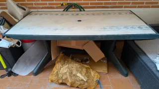 Mesa de exterior con un diseño elegante y funcional. Perfecta para disfrutar de tus espacios al aire libre. - Superficie con detalles decorativos. - Patas robustas para mayor estabilidad y extraíbles. - Conjunto de 6 sillas a juego con la mesa. Tiene una pequeña parte rota, tal y como se puede observar en la foto, pero no afecta a la funcionalidad.
