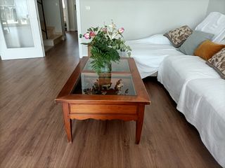 Conjunto de muebles de madera de salón compuesto de: Mesa de comedor redonda extensible (de 110 a 155 cm.) con 6 sillas, aparador (157x45x90 cm.), mesa de centro con expositor (120x70x46 cm.), mesa auxiliar con expositor (70x70x 55 cm.) y escritorio (80x40x146 cm.). Se venden juntos o por separado. Modelo Ordesa. Tienen un estilo elegante que no pasa de moda. Están en buen estado.
