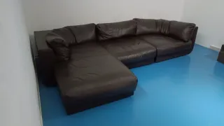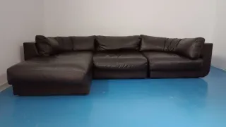 Conjunto de sofá chaiselongue y mesa de centro con puffs integrados. - Sofá chaiselong de gran tamaño, tapicería de polipiel, color marrón oscuro. Estructura robusta. - Mesa de centro con cubierta de cristal + 4 puffs integrados para asientos adicionales, acabado en polipiel.