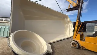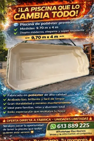 Piscina de poliéster premium con diseño moderno y elegante. Es muy resistente y fácil de mantener. - Medidas: 9,70 m x 4 m. - Acabado liso, brillante y fácil de limpiar. - Gran durabilidad y mínimo mantenimiento. - Ideal para familias, relax y diversión total. - Estilo espectacular que revaloriza tu hogar.