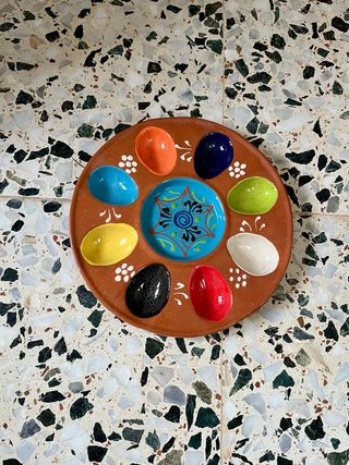 Huevera artesanal de cerámica con un diseño vibrante y colorido. Perfecta para presentar huevos de forma decorativa. - Capacidad para 8 huevos. - Diseño central con motivos florales. - Acabado esmaltado brillante.