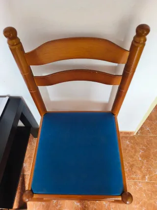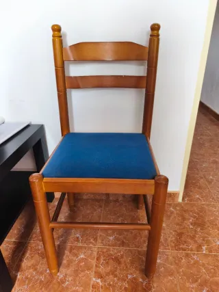 Silla de madera con un cómodo asiento tapizado en tela azul. - Estructura de madera de color marrón. - Asiento de tela en color azul.