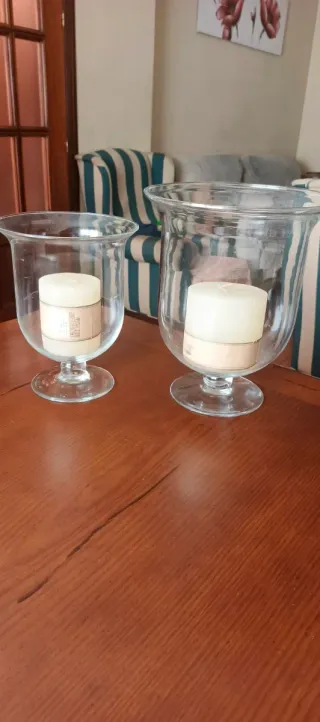 Elegantes porta velas de cristal, perfectos para añadir un toque de luz y estilo a tu hogar. Su diseño transparente realza la belleza de cualquier vela. - Set de 2 porta velas. - Base con pie para mayor estabilidad.