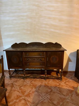Aparador de madera maciza con un diseño inspirado en el Renacimiento español. Presenta tallas detalladas y un acabado oscuro que le confiere elegancia. - Diseño con puertas y cajones. - Tallas ornamentales en puertas y frontal. - Patas torneadas con detalles decorativos.