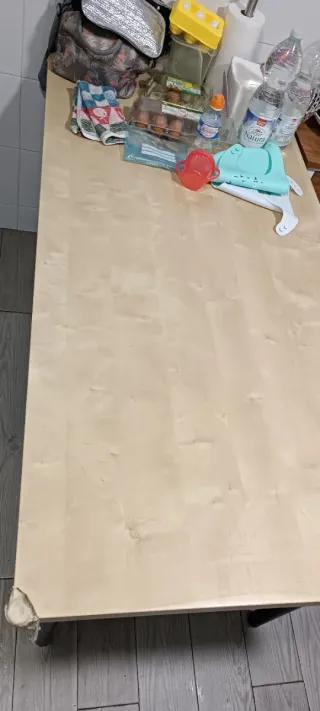 Mesa de cocina con un diseño moderno y funcional. Sus patas se pueden desmontar fácilmente para su transporte o almacenamiento. - Tablero de madera. - Patas de metal.