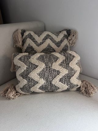 Añade un toque de estilo a tu hogar con estos cojínes. - Diseño geométrico en tonos beige y negro. - Acabado con borlas decorativas en las esquinas. - Tejido suave y agradable al tacto. - Medidas 0,45cm. x 0,46cm. - 6€ unidad.