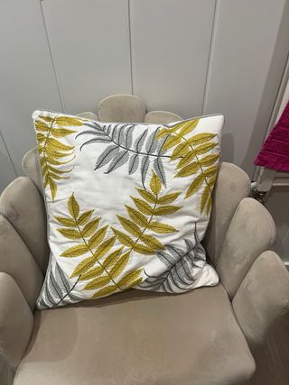 Cojín rectangular con un diseño de zig-zag bordado. - Medidas aproximadas de 40x65 cm. - Adornado con pequeños pompones en las esquinas. - Tejido suave al tacto. Creo que esta medida ya está descatalogada por eso vendo con su relleno.