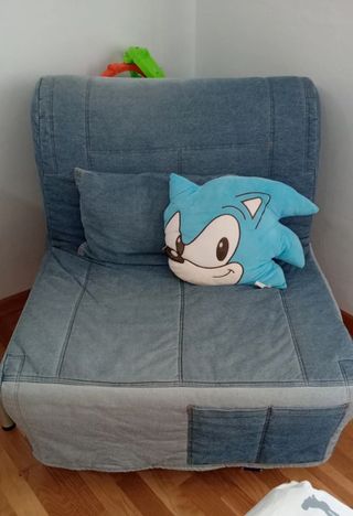 Sofá cama individual de IKEA, perfecto para espacios pequeños. Su diseño moderno y funcional se adapta a cualquier habitación. - Con bolsillos y cremallera - Tapicería de tela. - Estructura de hierro - Colchón de 80cm - Incluye cojín vaquero a juego 45x30