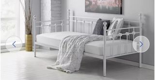 Maravilloso mueble multifuncional. Esta atractiva y versátil estructura de cama de 3 lados es una cama sumamente cómoda. Además, se puede rellenar con cojines para convertirla en sofá o zona de estar. Úsala para transformar tu dormitorio en un estudio al instante. Con un hermoso diseño en acero con acabado blanco y postes esquineros, es fresca y contemporánea con líneas clásicas. Con más de 30 cm de espacio libre, también ofrece amplio espacio de almacenamiento inferior para guardar juguetes, tesoros, bolsos y más. Parte de la colección Abigail. Marco de metal. Base con láminas metálicas. Tamaño W96.2, L198.2, H95cm. Altura hasta