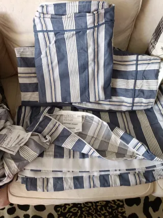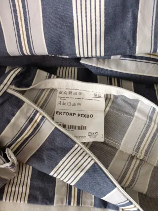 Funda para sofá cama Ektorp Pixbo 3 plazas con un diseño de rayas azules, blanco y grises. NUEVO sin estrenar Base, tres cojines respaldo y tres asientos - Diseño de rayas verticales. - Tejido de tela.