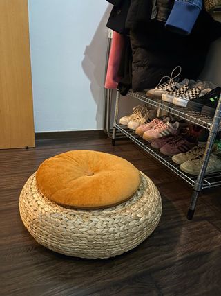 Puf de mimbre de Ikea con un cojín redondo. - Base tejida en mimbre. - Cojín de tela en color naranja.