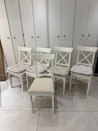 Conjunto de sillas Ikea con un diseño moderno y funcional. - Asiento y respaldo en plástico blanco. - Cojín de asiento en tela beige. - Patas metálicas.