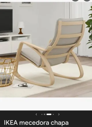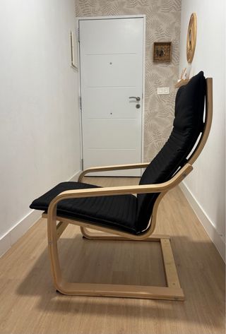 Cómoda mecedora Poäng de Ikea. Su diseño curvo ofrece un balance suave. - Estructura de madera. - Cojines acolchados en color crudo. El cojin tiene una pequeña mancha pero ikea también vende reposición del cojín. Solo la estructura nueva vale 150€