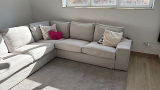 Sofá modular Kivik de Ikea con capacidad para 5 personas. Su diseño moderno y sus cojines amplios lo hacen muy cómodo. - Tapicería de tela en tono beige. - Incluye cojines decorativos. - Estructura robusta y duradera.
