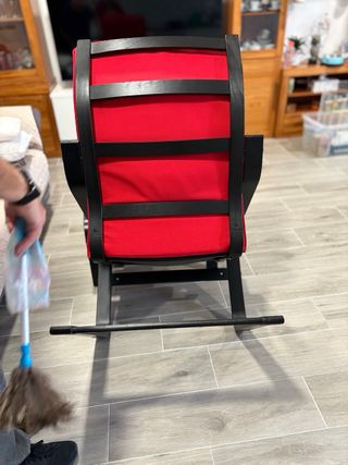 Cómodo sillón de Ikea con reposapiés. - Estructura de madera oscura. - Tapicería de tela roja. - Incluye cojín para la cabeza.
