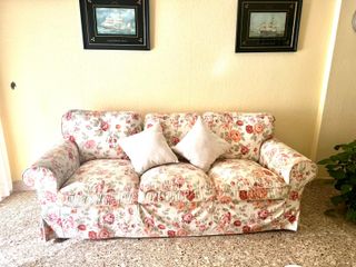 Sofá de tres plazas modelo Ektorp de IKEA con funda de tela con estampado floral. Incluye dos cojines decorativos a juego. Tiempo de uso 3 años. Excelente estado