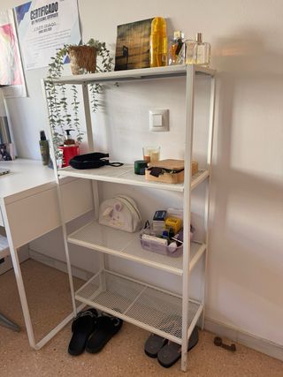 Conjunto de mobiliario para tu espacio de estudio o trabajo. - Escritorio blanco con cajón. - Estantería blanca de 4 baldas. - Silla plegable negra con cojín.